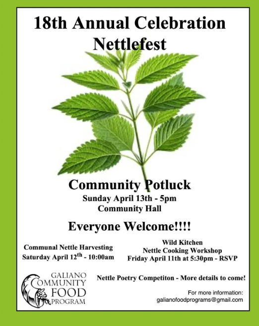 While Saturna celebrated Nettlefest on March 29 with an inspired six-course nettle meal, you still have time to partake and participate in Mayne and Galiano’s upcoming celebrations on April 11 and 13, respectively.