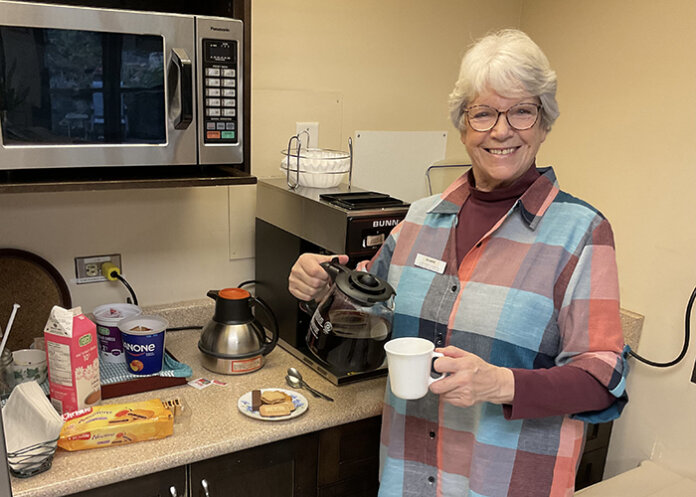 A. I spend one hour on Wednesdays making coffee and tea, serving that and cookies to the residents. I also took on buying the cookies with money from the auxiliary and Country Grocer.